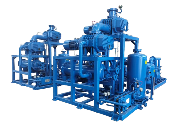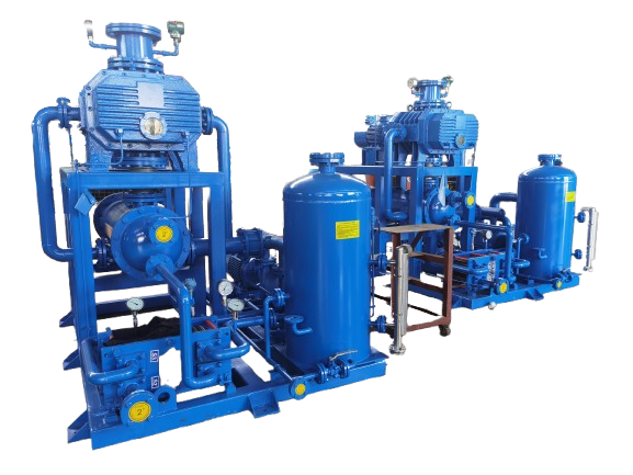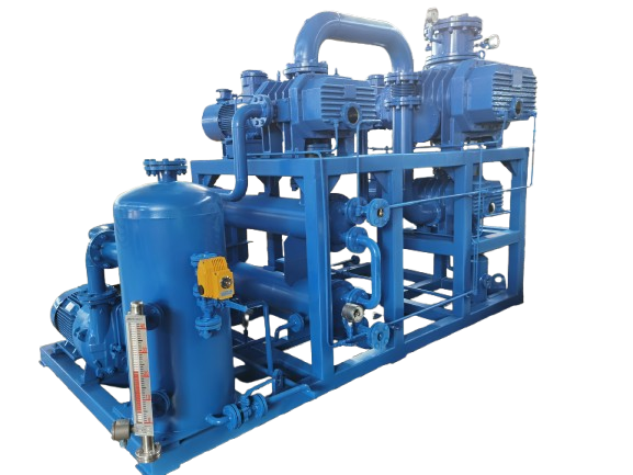 多級(jí)羅茨泵通過多級(jí)轉(zhuǎn)子的串聯(lián)實(shí)現(xiàn)多個(gè)羅茨泵串聯(lián)的效果,所以多級(jí)羅茨泵并不能比單級(jí)羅茨泵擁有更大的抽速,其理論抽速是取決于第一級(jí)的理論抽速。但是這種結(jié)構(gòu)卻可以使羅茨真空泵達(dá)到很高的壓縮比。因此,多級(jí)羅茨泵是可以作為主泵直排大氣,而無需再配置前級(jí)泵,這樣就可以避免前級(jí)泵環(huán)節(jié)給系統(tǒng)帶來的油氣污染。3~ 6 級(jí)的羅茨泵可從大氣壓抽到0壓力1Pa ,如此高的壓力差會(huì)使轉(zhuǎn)子過熱膨脹,而產(chǎn)生卡死現(xiàn)象.所以要在高壓段對(duì)轉(zhuǎn)子進(jìn)行氣冷.以控制轉(zhuǎn)子的溫度不超過其允許范圍。一般的氣冷方案是使從各級(jí)的排氣口排出的氣體流經(jīng)冷卻器冷卻,再返回到該級(jí)的工作腔中.利用冷卻氣體來冷卻轉(zhuǎn)子。當(dāng)然.這種冷卻方法是要以損失羅茨泵的抽速為代價(jià)的.為了防止軸承和齒輪的潤滑油向泵腔內(nèi)返流,多級(jí)羅茨泵的泵腔和齒輪箱之間隔開或用迷宮式結(jié)構(gòu)加以密封,為了提高無油的程度,齒輪箱也有另外用真空泵排氣的情況。